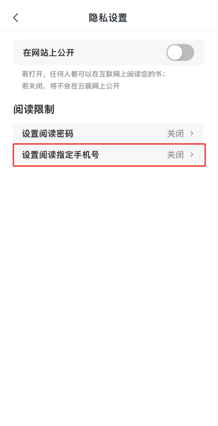 點擊【設(shè)置閱讀指定手機號】,將【開啟手機號限制】打開,在下方手機號列表框輸入手機號,可以輸入一個或者多個,也可以根據(jù)自己需要設(shè)置訪問提示,設(shè)置完點左上角箭頭退出即可。