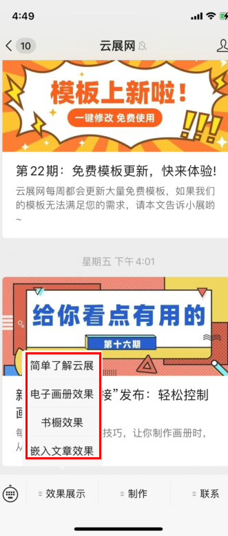 您可以把云展網(wǎng)生成的電子書/書櫥分享到微信公眾號(hào)上,提高曝光率讓更多人看到,把電子書/書櫥放到公眾號(hào)讓讀者閱讀,有四種展現(xiàn)形式。