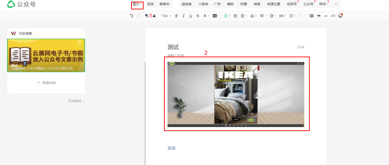 1、 在公眾號(hào)文章中,上傳需要設(shè)置跳轉(zhuǎn)的圖片