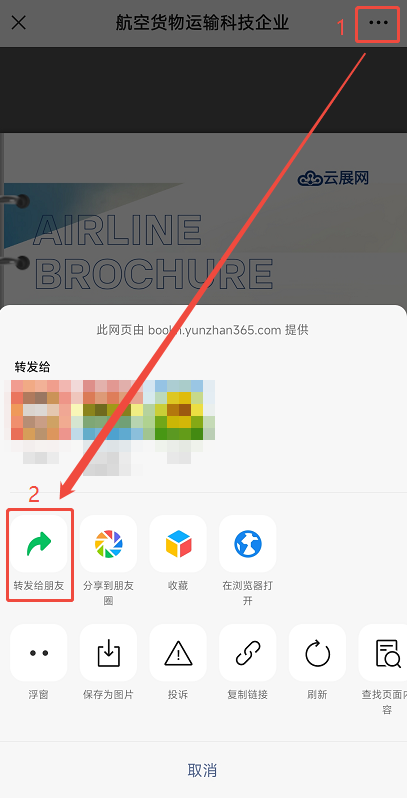 b)打開電子書后,點擊右上角三個點,選擇【轉發(fā)給好友】,即可分享出名片的形式。