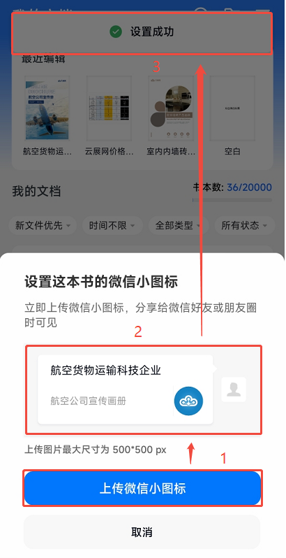 (2)點擊【上傳微信小圖標】,選擇手機里的圖片文件,支持上傳JPG/PNG/JPEG格式的圖片,推薦尺寸是200x200px,最大尺寸是500x500px,上傳成功后最上方會顯示設置成功,中間可以預覽分享到微信上的樣式。