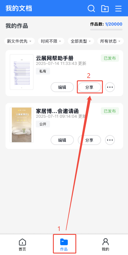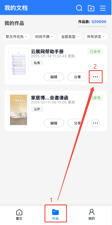 (1)點擊【作品】,然后點擊對應電子書右邊的三個點,最后點擊【微信小圖標】。