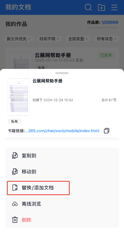 點(diǎn)擊【作品】,點(diǎn)擊對(duì)應(yīng)電子書右邊的三個(gè)點(diǎn),然后點(diǎn)擊【替換/添加文檔】,打開(kāi)替換文檔界面。