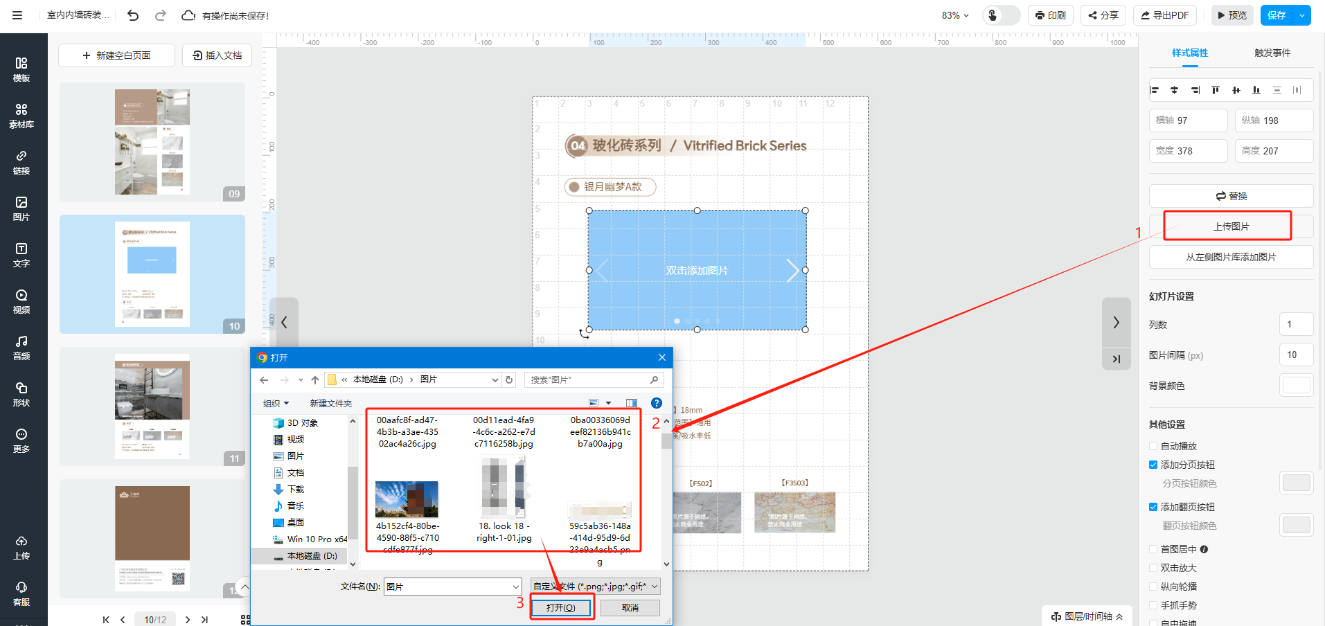 點(diǎn)擊【上傳圖片】,選擇圖片后,點(diǎn)擊【打開(kāi)】,將圖片添加到幻燈片中