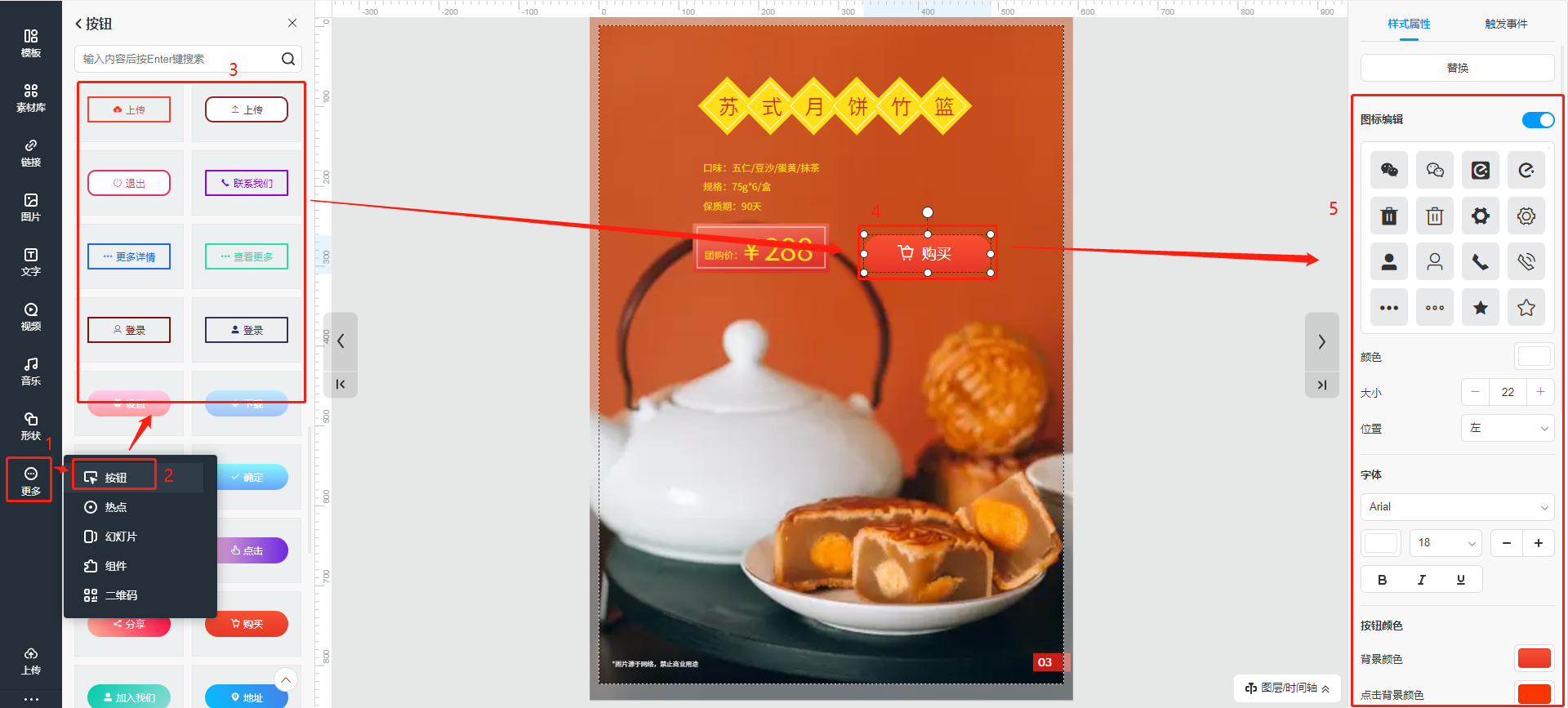 點擊【更多】,選擇【按鈕】,挑選一個功能按鈕,點擊便會出現(xiàn)在頁面上,移動到合適的位置,雙擊按鈕可以更改文字,右側(cè)可更改其他樣式屬性。