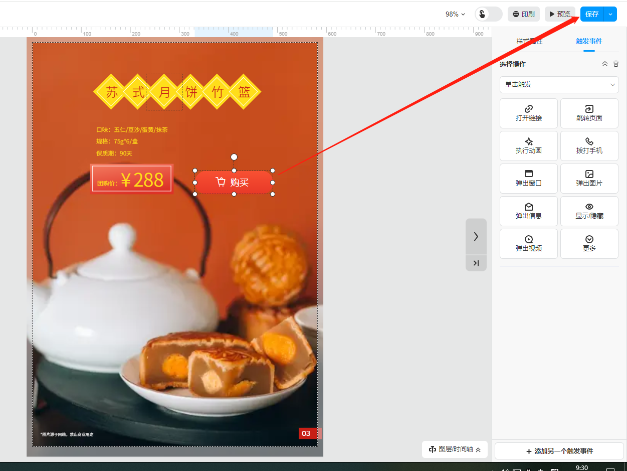 選中功能按鈕,點擊右上角【觸發(fā)事件】,選擇事件。