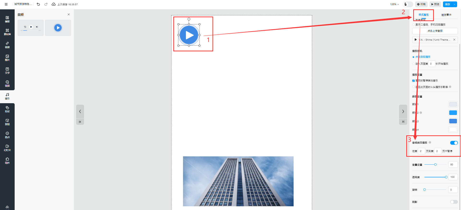 選中音頻播放器,點(diǎn)擊【樣式屬性】,勾選【音頻跨頁(yè)播放】,設(shè)置音頻跨頁(yè)播放的頁(yè)數(shù)
