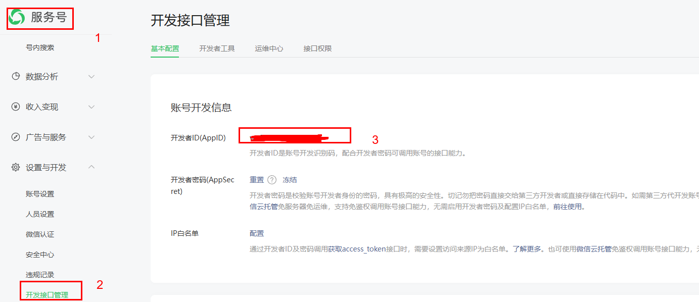 登錄你商戶平臺關(guān)聯(lián)的認(rèn)證微信公眾號,點擊左側(cè)菜單【設(shè)置與開發(fā)-開發(fā)接口管理】;在右側(cè)面板找到開發(fā)者ID(AppID)即為AppID。
