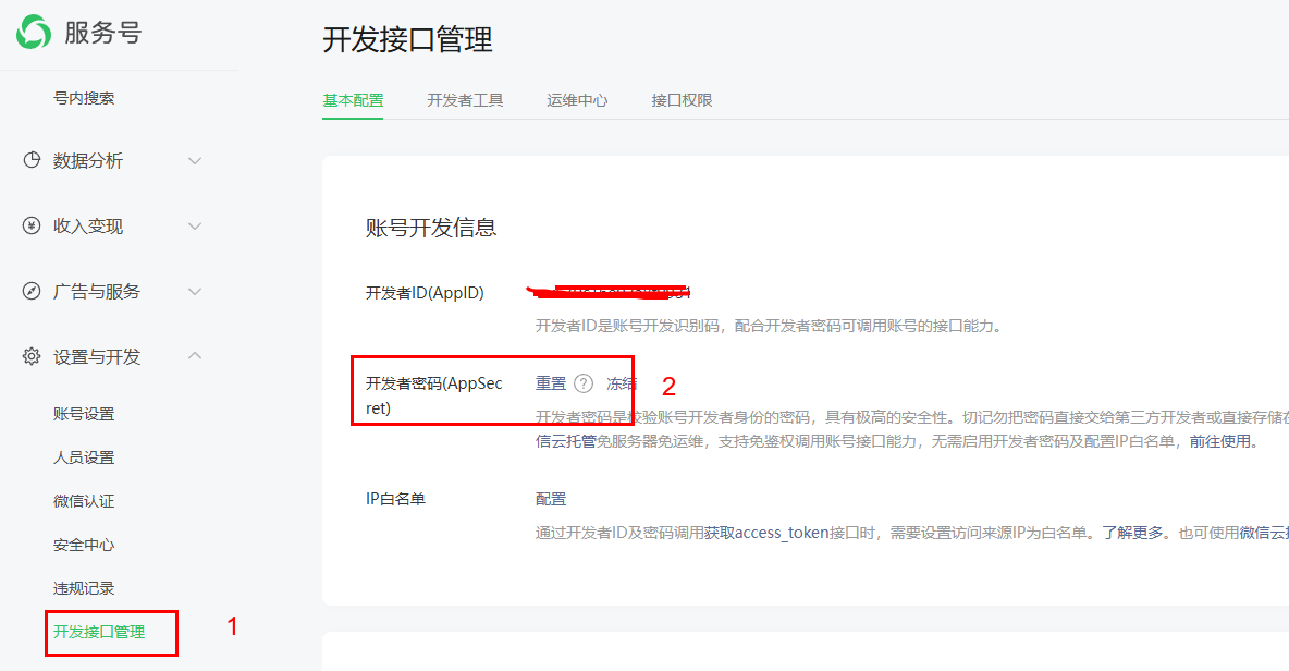 登錄你商戶平臺關(guān)聯(lián)的認(rèn)證微信公眾號,點擊左側(cè)菜單【設(shè)置與開發(fā)-開發(fā)接口管理】;在右側(cè)面板找到開發(fā)者密碼(AppSecret)即為AppSecret。