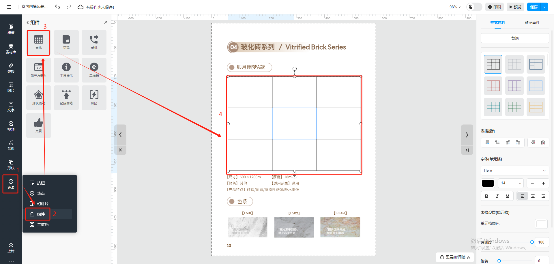 點擊【更多】,選擇【組件】,然后點擊【表格】,就會在頁面上出現(xiàn)一個表格。
