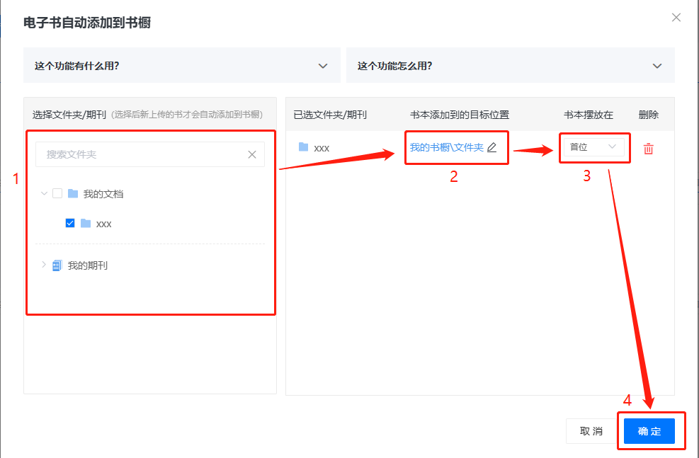 (2)左側(cè)選擇文件夾/期刊,右側(cè)選擇書本添加到的目標(biāo)位置和擺放位置,后續(xù)在所選文件夾/期刊內(nèi)新上傳的書,將會自動添加到該書櫥內(nèi)。