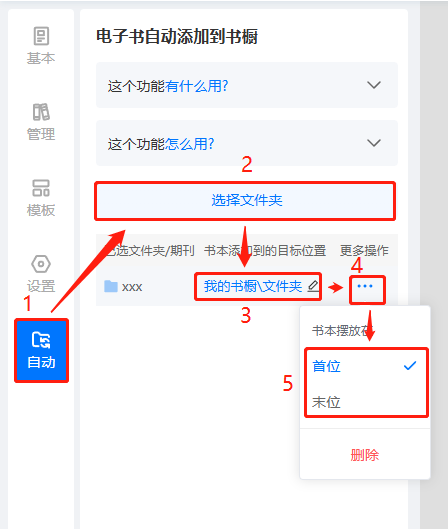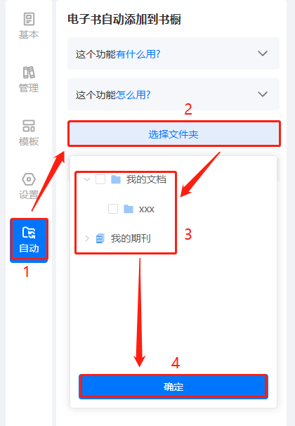 (2)先點(diǎn)擊【自動】,再點(diǎn)擊【選擇文件夾】,勾選文件夾/期刊,選擇書本需要添加到的目標(biāo)位置和擺放位置,后續(xù)在所選文件夾/期刊內(nèi)新上傳的書,將會自動添加到該書櫥內(nèi)。
