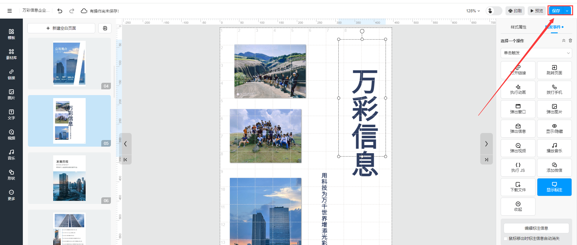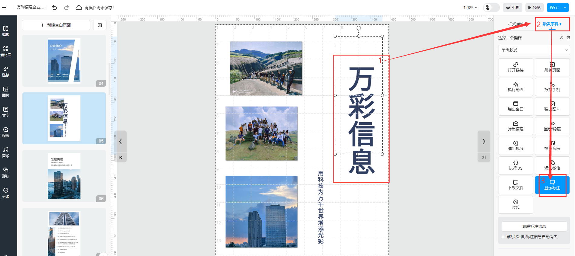 選擇圖片/文字/圖標(biāo),點(diǎn)擊【觸發(fā)事件】,對(duì)其設(shè)置【顯示標(biāo)注】功能