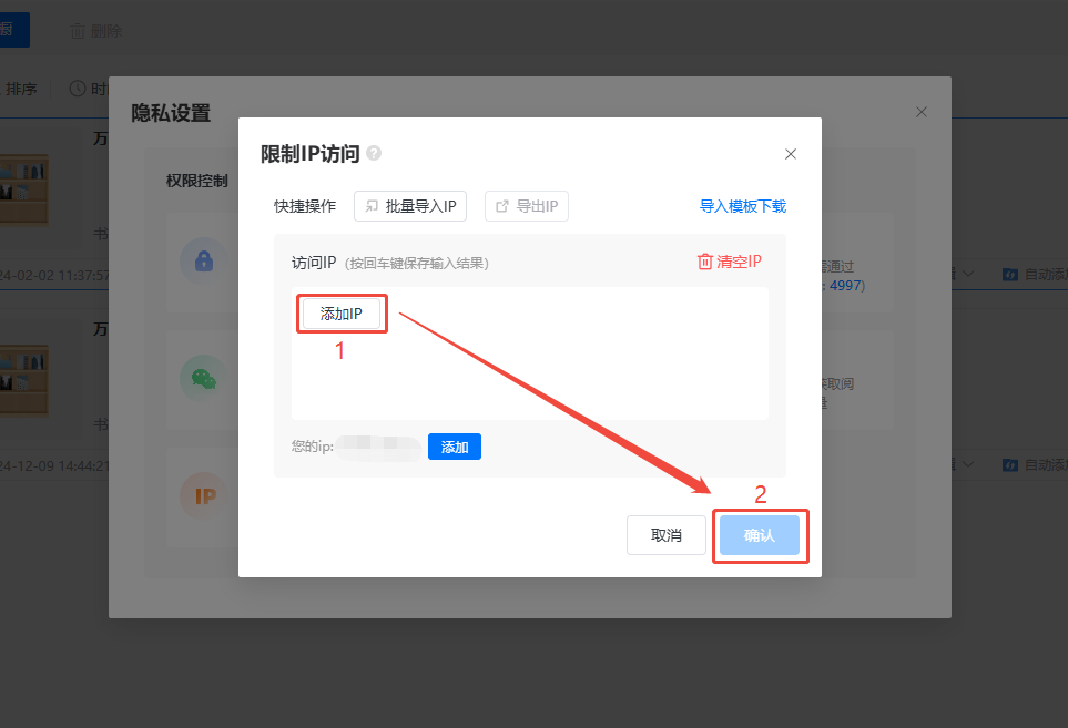勾選【限制訪問IP】彈出彈窗,點擊【添加IP】輸入IP地址后點擊【確認(rèn)】即可。