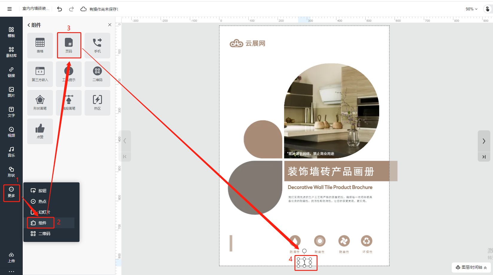 點擊【更多】,選擇【組件】,點擊【頁碼】,頁碼會自動按順序出現在所有的書本頁面上。