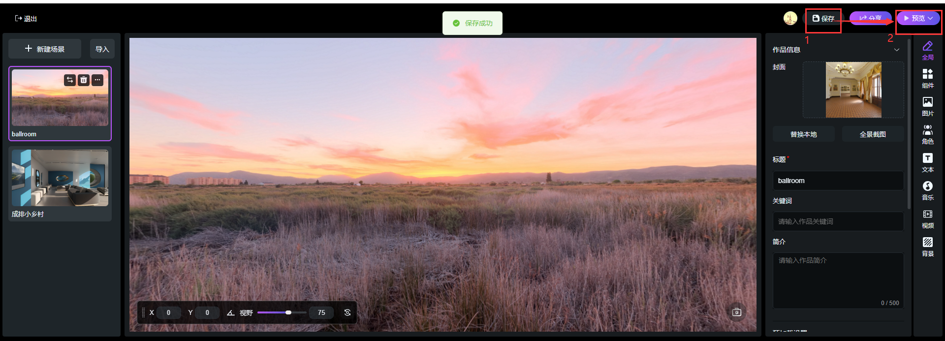 在頁面右側(cè)可設(shè)置組件、圖片、角色、文本、音樂、視頻等多種交互元素,滿足客戶的不同使用需求,同時可引導(dǎo)觀眾探索,增強故事敘述,使得虛擬體驗更加生動和有趣。
