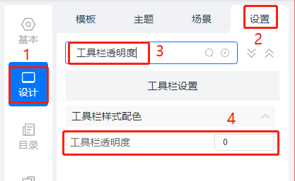 點(diǎn)擊【設(shè)計(jì)】,再點(diǎn)擊【設(shè)置】,將【工具欄透明度】改為0