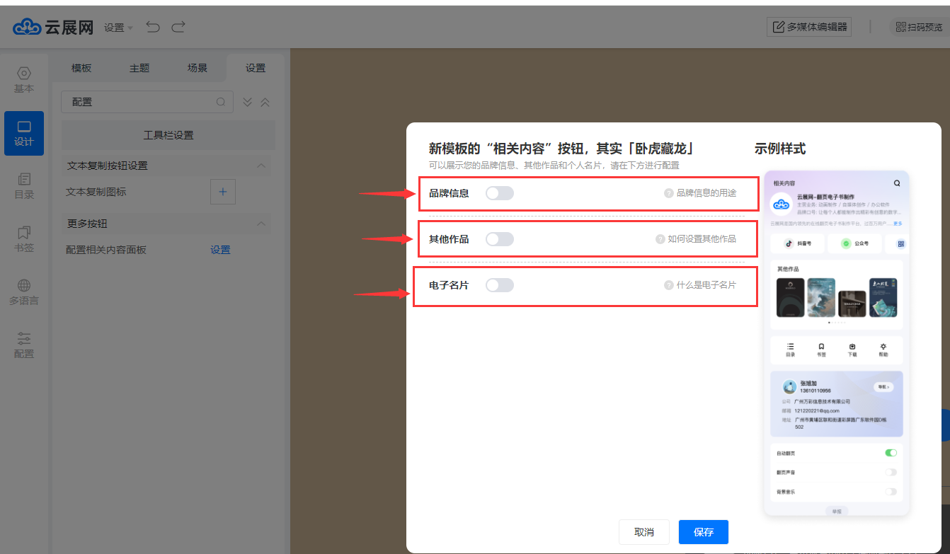 “相關(guān)內(nèi)容”面板功能有三個,【品牌信息】、【其他作品】、【電子名片】。