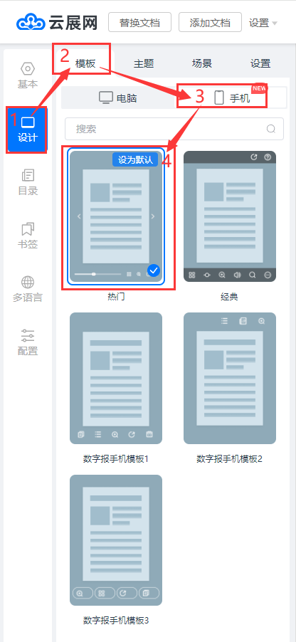 點擊【設(shè)計】,點擊【模板】,點擊【手機】,選擇熱門模板