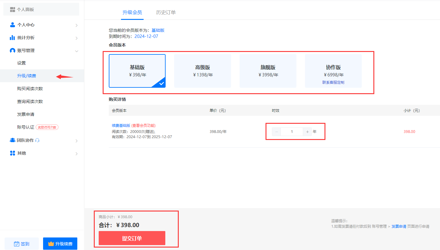 登錄需要續(xù)費(fèi)的賬號(hào),然后選擇購(gòu)買的版本,提交訂單以后選擇支付方式付款。如圖: