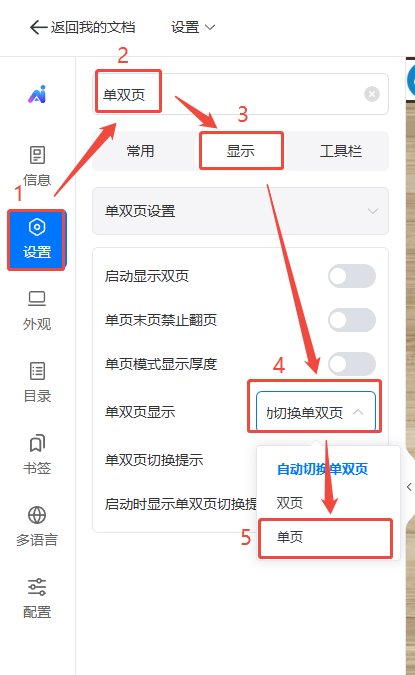 點擊【設(shè)置】,上方搜索欄搜索【單雙頁】,【單雙頁顯示】選擇【單頁】后便會自動保存。