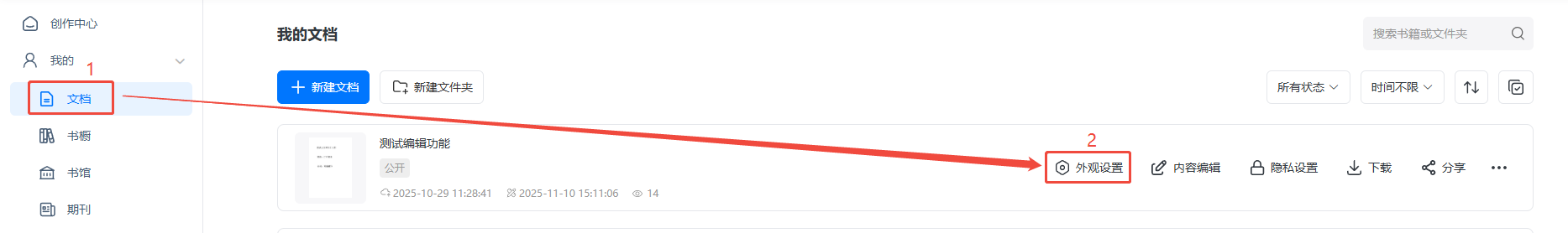 在【文檔】頁面找到需要設置的書籍,點擊【外觀設置】進入