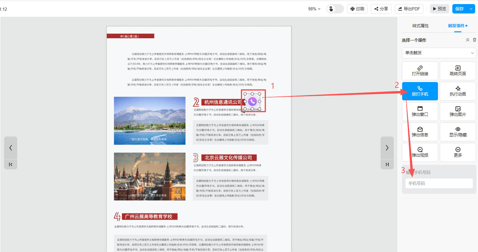 這個(gè)功能主要是為了方便讀者聯(lián)系制作者,制作者可以在書本頁面添加電話按鈕并設(shè)置電話號(hào)碼,點(diǎn)擊電話按鈕可以直接撥打電話。