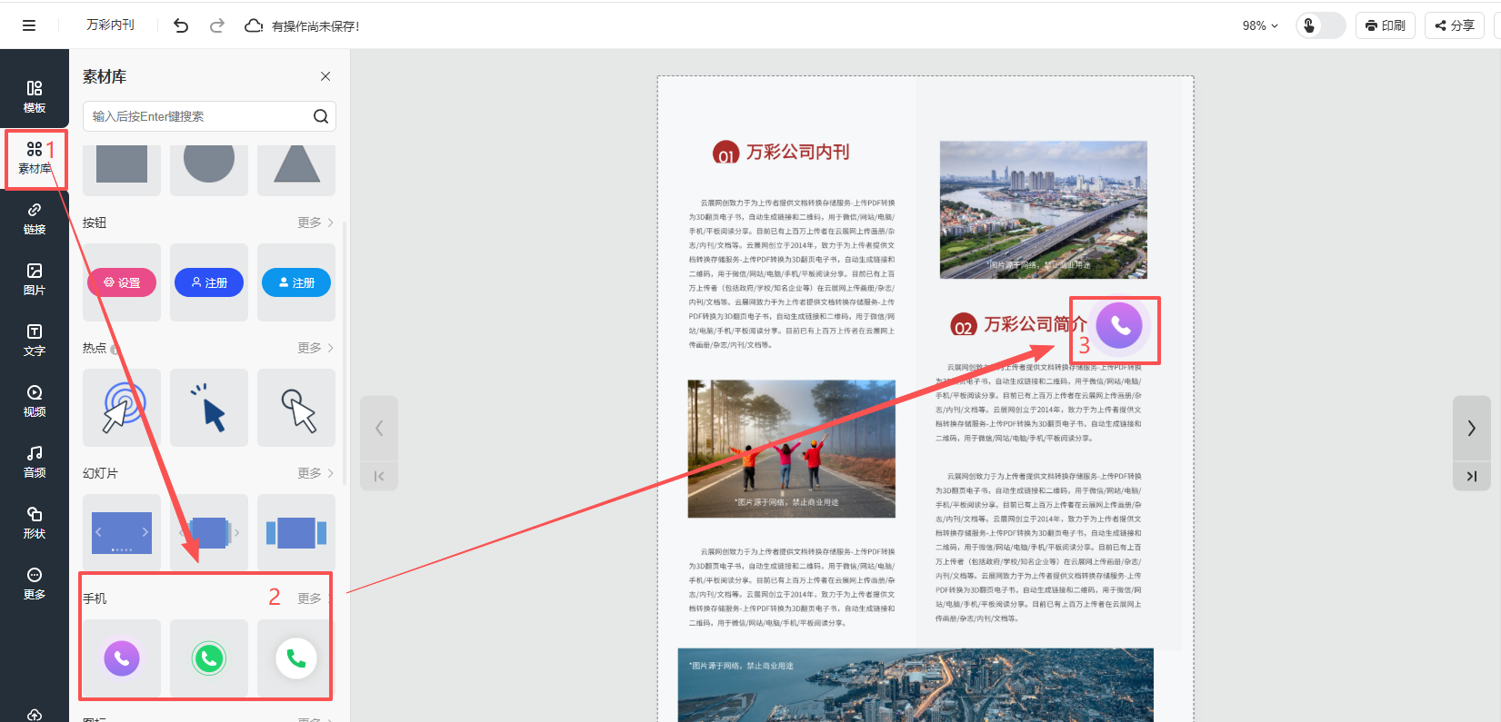 點(diǎn)擊【素材庫】,點(diǎn)擊【手機(jī)】,然后選擇電話按鈕樣式,就會(huì)有一個(gè)電話按鈕出現(xiàn)在頁面上。