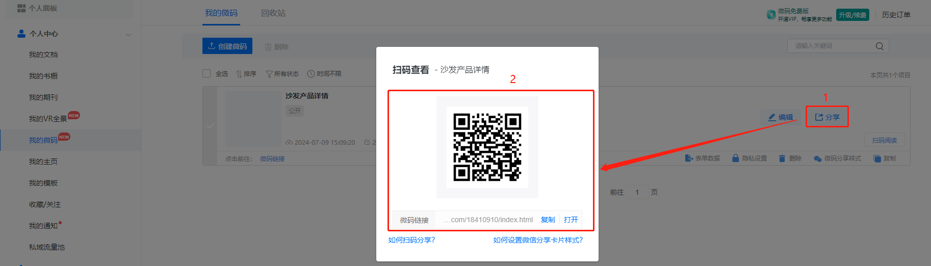 (2)點擊【我的微碼】,然后點擊【分享】,即可獲取鏈接和二維碼。