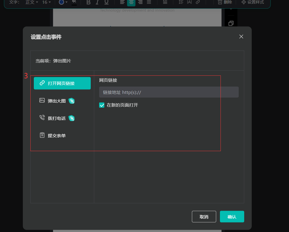 點擊“按鈕”,點擊【添加動作】,可以設置打開網(wǎng)頁鏈接/彈出大圖/撥打電話/提交表單,設置好后,點擊【確認】