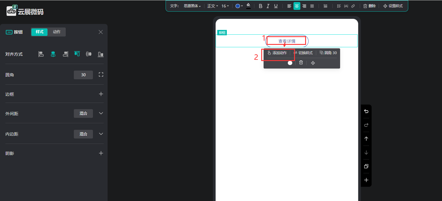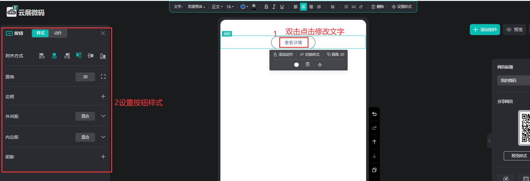 微碼頁面可以添加按鈕,可根據(jù)需要設置不同的動作屬性滿足您的使用需求,如“撥打電話、提交表單、跳轉(zhuǎn)鏈接、彈出圖片”等。
