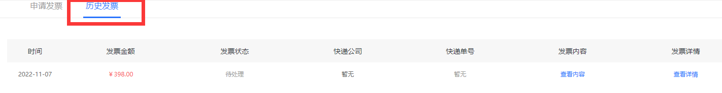 4、在歷史發(fā)票可以查看您申請的發(fā)票內(nèi)容,寄送單號等。