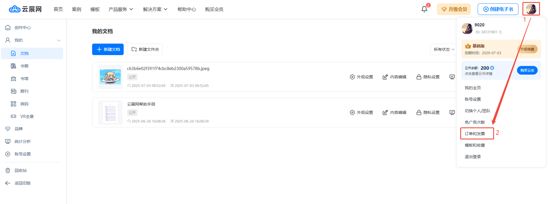1、登錄云展網(wǎng)賬號,然后點擊右上角頭像,點擊【訂單和發(fā)票】。