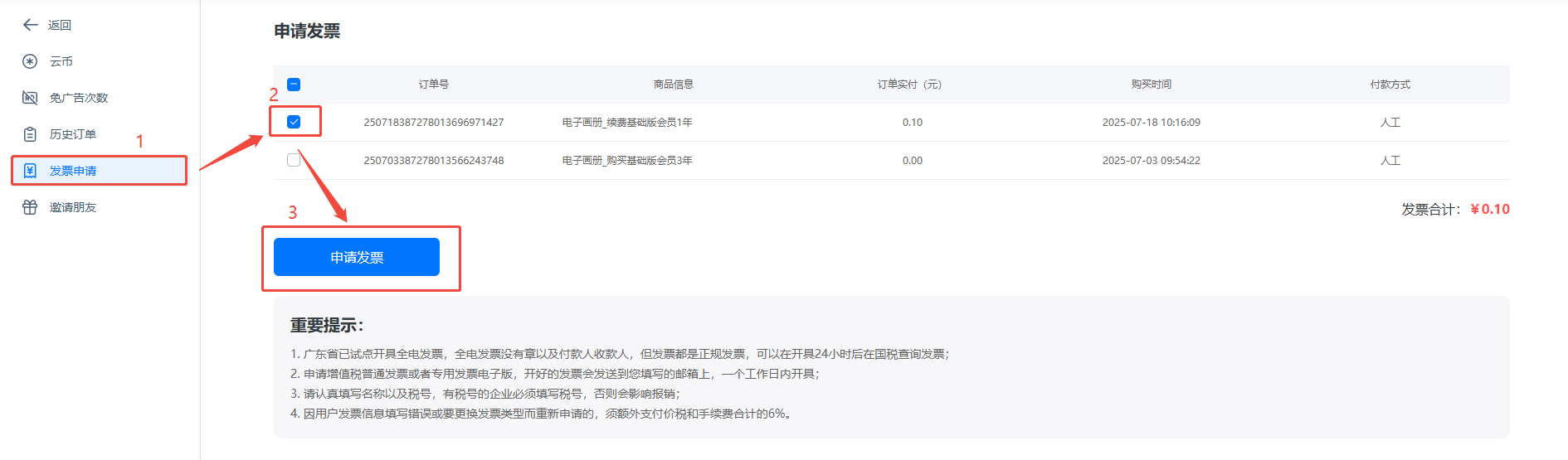 只要是在云展網(wǎng)支付了款項,金額超過0.1元的訂單,都可以申請發(fā)票。