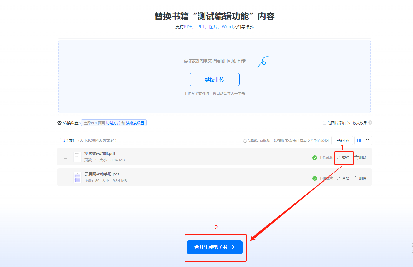 如果之前上傳的是多個(gè)文件,點(diǎn)擊替換,把舊文件替換成新文件,然后點(diǎn)擊【合并生成電子書】。