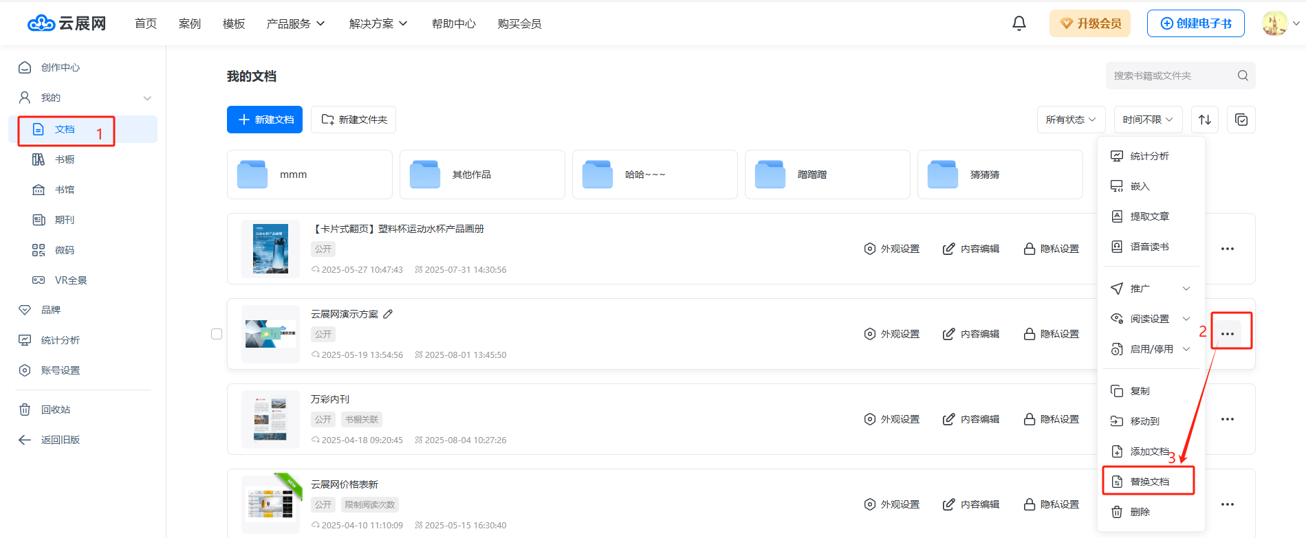 進(jìn)入【文檔】頁(yè)面,選擇需要替換內(nèi)容的書本,點(diǎn)擊右邊三個(gè)點(diǎn),點(diǎn)擊【替換文檔】,進(jìn)入替換文檔界面。